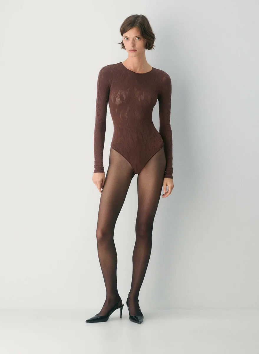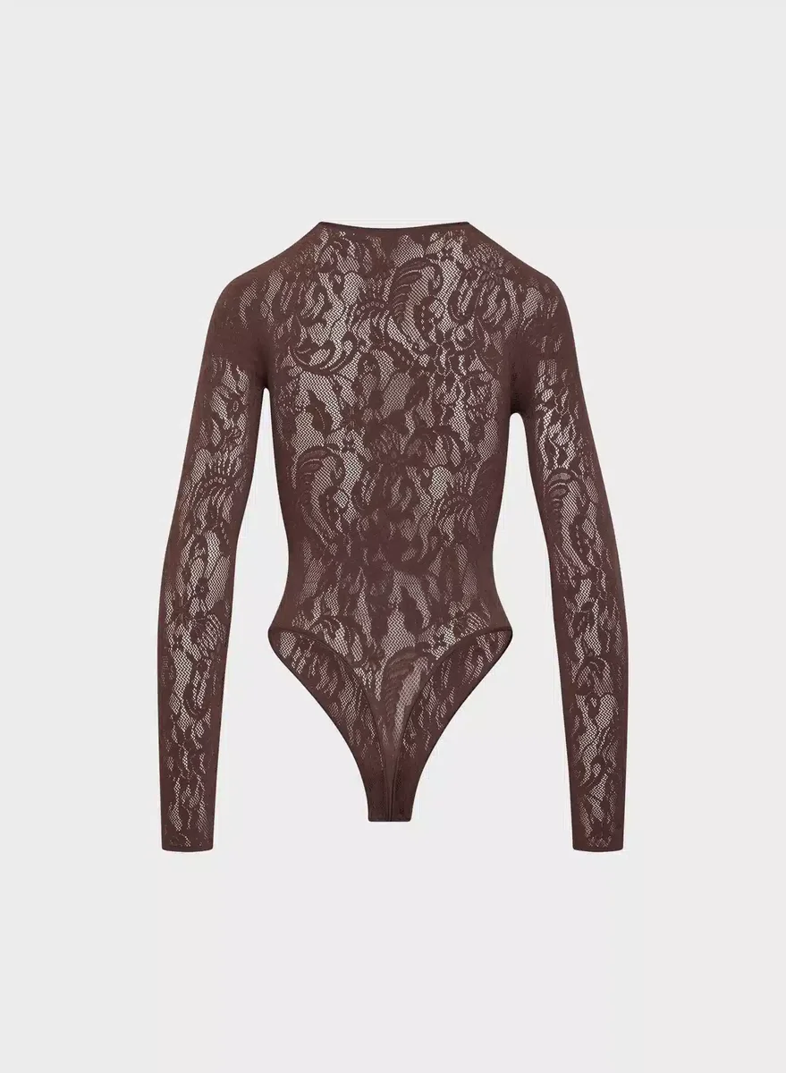 This is a longsleeve crewneck bodysuit with a seamless construction and thong-cut bottom. It’s made with Flora Seamless — fine sheer lace that forms to your shape for a perfect fit. It’s constructed with minimal seam lines and innovative tubular-knit technology for a smoothing look and ultra-comfortable feel.