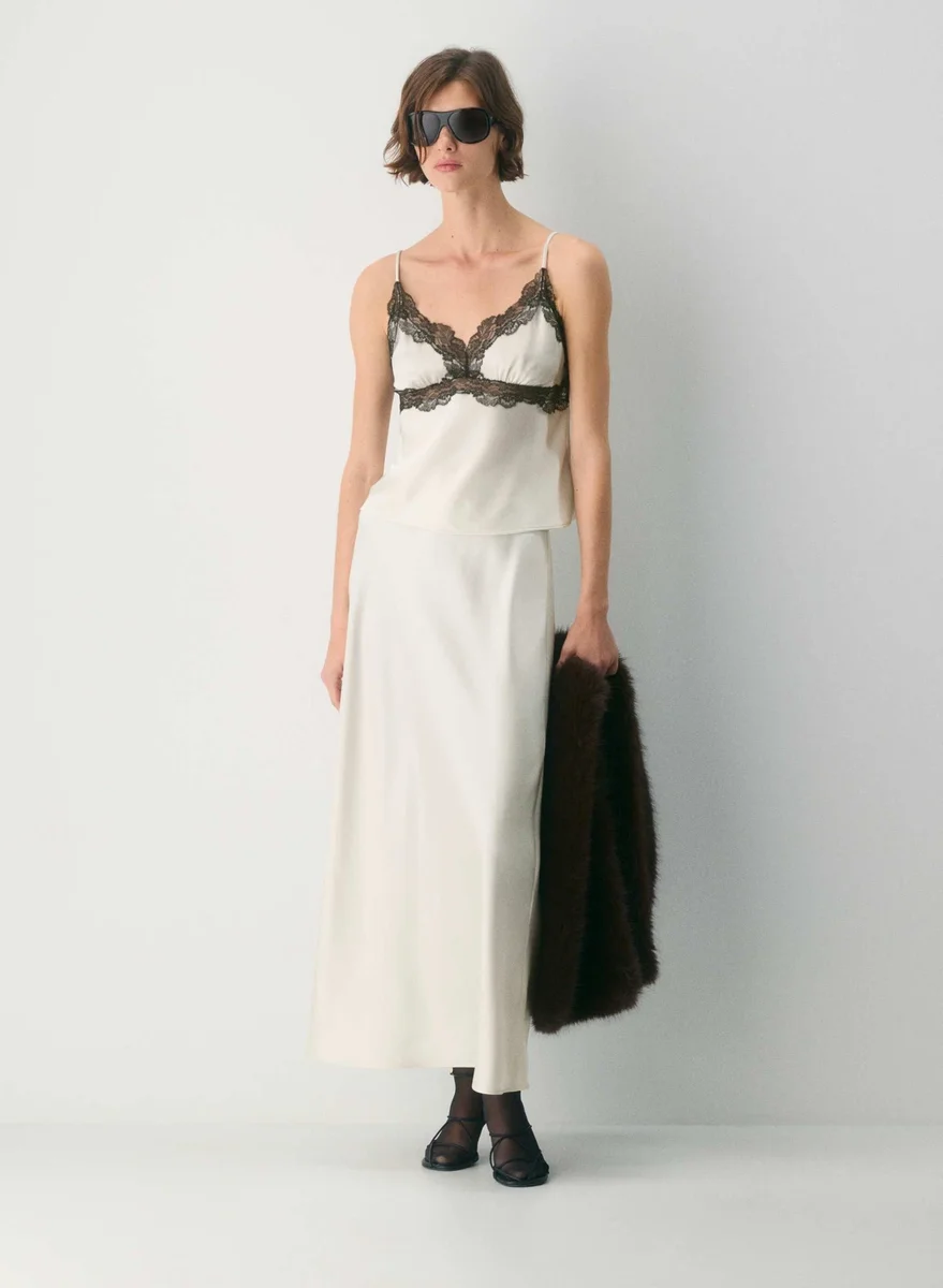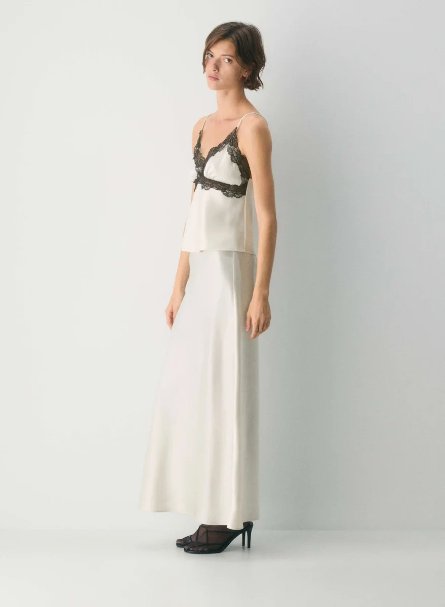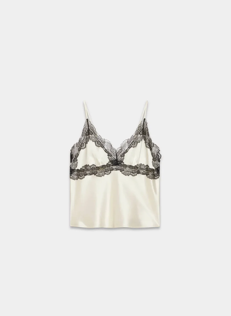 This is a V-neck camisole with adjustable straps and lace trim. It’s made from double-faced satin with a soft sheen and luxurious next-to-skin feel. This fabric is made with 80% Naia™ Acetate.